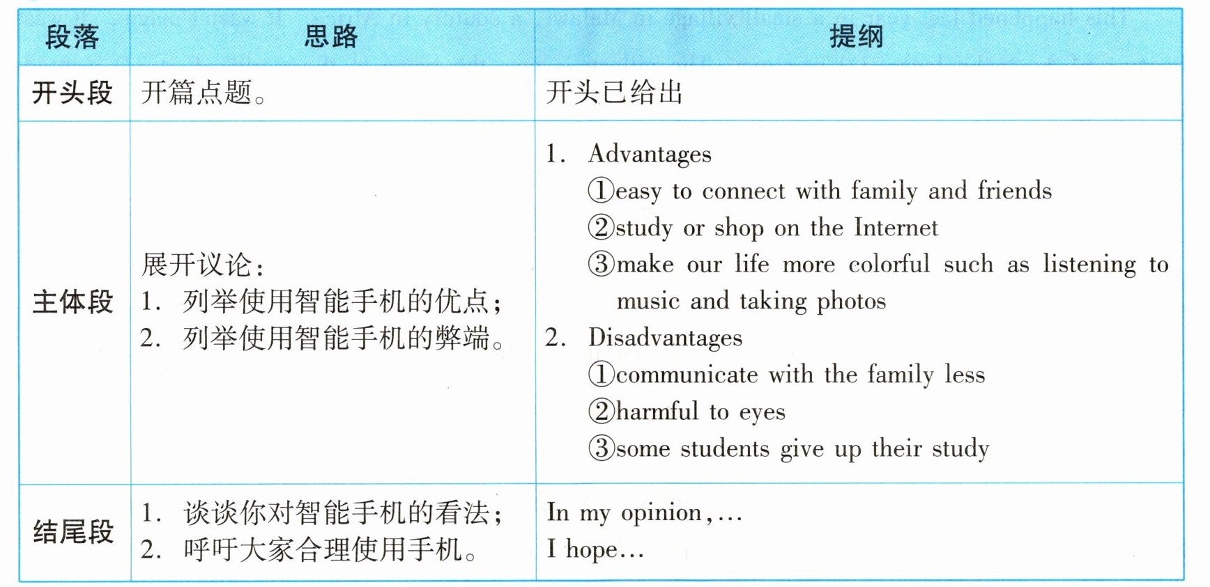 There are some advantages. First, smartphones make it convenient for us to keep in touch with our family and friends. (优点1) Second, smartphones can replace computers in some ways. For example, we can use them to study or shop on the Internet. (优点2) Third, smartphones can also make our life more colorful, such as listening to music and taking photos. (优点3)