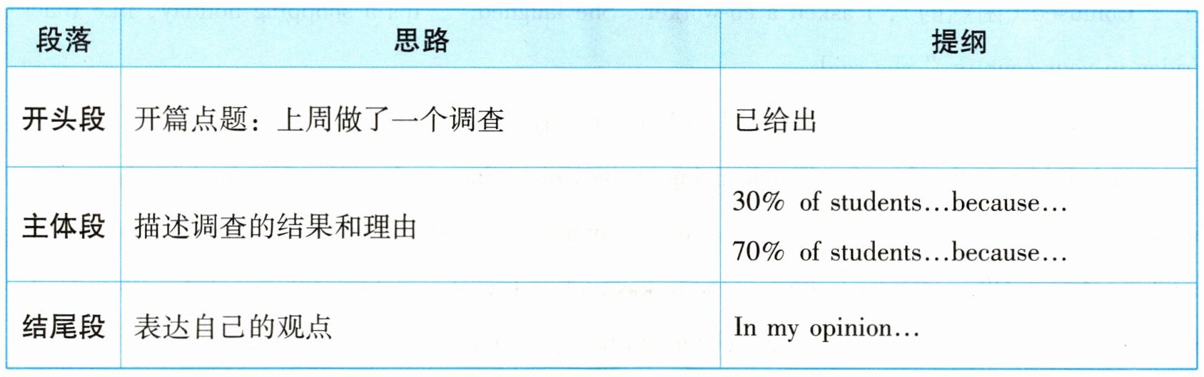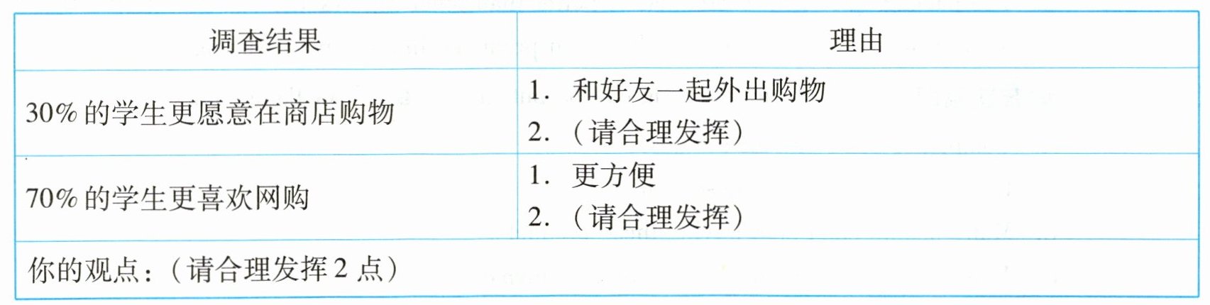 30% of the students are more willing to shop in stores. (结果 1) That’s because they like going out and shopping with friends. (理由 1) They can also see the actual objects. If they buy clothes, they can also try them on. (理由 2) However, 70% of the students prefer to shop on the Internet. (结果 2) They think it’s more convenient. Just by a click of the mouse, they can buy what they’re interested in without going outdoors. (理由 3) What’s more, nearly all goods can be found online. (理由 4)