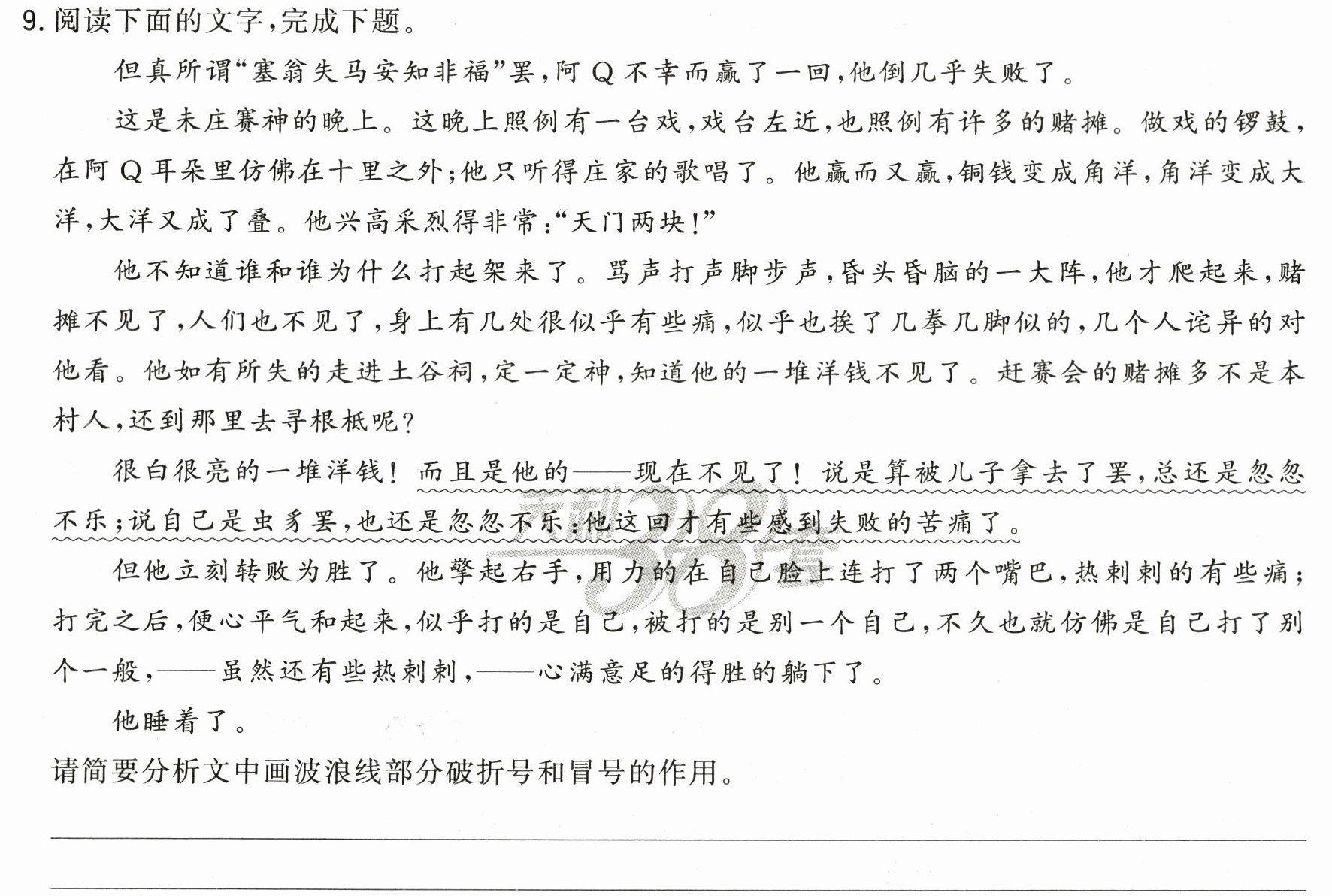 ①破折号:语意转折,表现了阿Q拥有金钱的快乐和失去金钱后的失落之间的巨大反差;②冒号:总结上文,表现了阿Q使用精神胜利法自欺欺人,最终也没能掩盖住失败的痛苦。