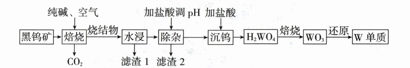 [解析]由流程图及题给化学方程式可知,黑钨矿、空气和纯碱经过焙烧得到Fe₂O₃、MnO₂、Na₂WO₄、Na₂SiO₃,烧结物水浸过滤,滤渣1为难溶于水的Fe₂O₃和MnO₂,滤液中含有Na₂SiO₃、Na₂WO₄,加盐酸调pH后生成硅酸沉淀,过滤后滤液中再加盐酸沉钨,生成钨酸沉淀,H₂WO₄经过焙烧生成WO₃,WO₃还原得到W单质。烧结物粉碎成粉后,可以增加与水的接触面积,加快水浸的溶解速率,A正确;金属活动性:Al>W,可以采用铝热反应将WO₃还原成单质W,B正确;由流程分析可知,滤渣1的成分是氧化铁和二氧化锰,滤渣2的成分是硅酸,C错误;加盐酸调节pH,硅酸根离子先沉淀,钨酸根离子后沉淀,可知硅酸根离子结合氢离子的能力更强,D正确。