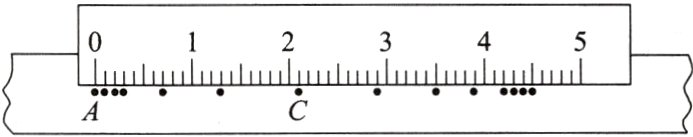 2. 如图所示的是一位同学用手拉动纸带通过电磁打点计时器打出的一条纸带,在纸带旁边放置一把毫米刻度尺,电源频率为50Hz,电磁打点计时器每隔________s打一个点。$A$为打下的第一个点,根据纸带上点的排列情况可判定,手拉动纸带时,手的运动为先________,后________,最后________;打$C$点时手拉动纸带的速度约为______m/s。(结果保留两位有效数字)