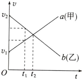 AD 解析:图线在横轴上方,速度均为正值,表示物体的运动方向均沿正方向,运动方向相同,A正确;由于在初始时刻甲、乙的位置关系未知,所以无法判断甲、乙在t₁时刻的位置关系,B错误;在t₁时刻图线b对应的纵坐标值大,故此时乙的速度比甲的速度大,C错误,D正确。