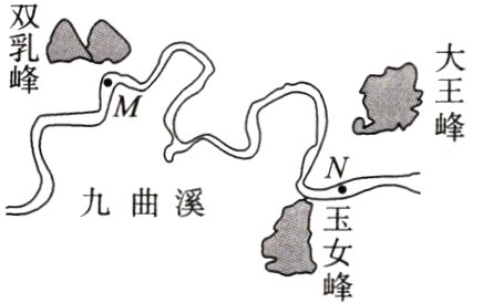 活动1 一游客在武夷山九曲溪乘竹筏漂流,途经双乳峰附近的$M$点和玉女峰附近的$N$点,示意图如图所示。已知该游客从$M$点漂流到$N$点的路程为$5.4km$,用时$1h$,$M$、$N$间的直线距离为$1.8km$,则从$M$点漂流到$N$点的过程中: