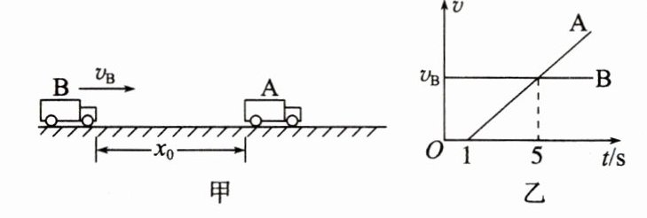 7. 如图甲所示,A车原来临时停在一水平路面上,B车在后面匀速向A车靠近,A车司机发现后启动A车,以A车司机发现B车为计时起点(t = 0),A、B两车的v - t图像如图乙所示。已知B车在第1s内与A车的距离缩短了x1 = 12m。