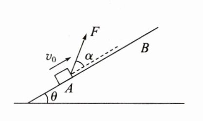 3. 如图所示,一质量为m = 0.6kg的小物块,在与斜面成α = 37°角的拉力F作用下,以$v_0 = 3m/s$的初速度沿斜面向上做匀加速运动,经t = 2s的时间物块由A点运动到B点,A、B之间的距离l = 10m。已知斜面倾角θ = 30°,物块与斜面之间的动摩擦因数μ = 0.5。取g = 10m/s²,sin37° = 0.6,cos37° = 0.8,求: