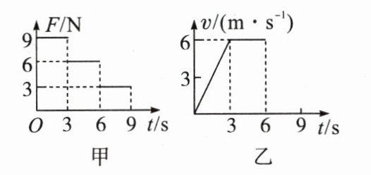 2. 放在水平地面上的一物块,受到方向不变的水平推力F的作用,力F的大小与时间t的关系如图甲所示;物块的运动速度v与时间t的关系如图乙所示,6s后的速度图像没有画出,取g = 10m/s²。下列说法正确的是( )