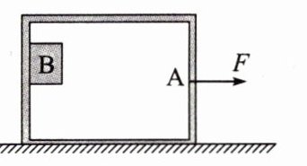 4. 如图所示,质量为M = 4.0kg的一只铁箱A在水平拉力F作用下沿水平面向右运动,铁箱与水平面间的动摩擦因数为$μ_1 = 0.20$。这时铁箱内有一个质量为m = 1.0kg的木块B,木块与铁箱内壁间的动摩擦因数为$μ_2 = 0.40$。(取g = 10m/s²)