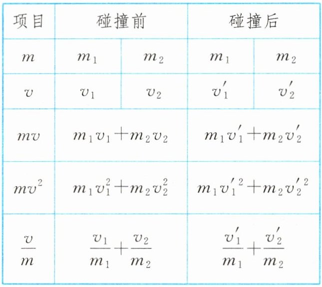 (2)①实验过程中使用气垫导轨可以大大减小因滑块和导轨之间的摩擦而引起的误差,还可以保证两个滑块的碰撞是一维碰撞。②滑块1碰撞之前的速度 $v_1=\frac{d}{\Delta t_1}=\frac{5\times10^{-3}}{10.01\times10^{-3}}\ m/s\approx0.50\ m/s$滑块1碰撞之后的速度 $v_2=\frac{d}{\Delta t_2}=\frac{5\times10^{-3}}{49.99\times10^{-3}}\ m/s\approx0.10\ m/s$滑块2碰撞之后的速度 $v_3=\frac{d}{\Delta t_3}=\frac{5\times10^{-3}}{8.35\times10^{-3}}\ m/s\approx0.60\ m/s$。③A. 滑块1和滑块2碰撞前、后质量与速度的乘积之和不变。理由:滑块1和滑块2碰撞前 $m_1v_1 = 0.15\ kg\cdot m/s$,滑块1和滑块2碰撞之后 $m_1v_2 + m_2v_3 = 0.15\ kg\cdot m/s$。B. 滑块1和滑块2碰撞前、后总动能不变。理由:滑块1和滑块2碰撞之前的总动能 $E_{k1}=\frac{1}{2}m_1v_1^2 = 0.0375\ J$滑块1和滑块2碰撞之后的总动能 $E_{k2}=\frac{1}{2}m_1v_2^2+\frac{1}{2}m_2v_3^2 = 0.0375\ J$所以滑块1和滑块2碰撞前、后总动能不变。答案: