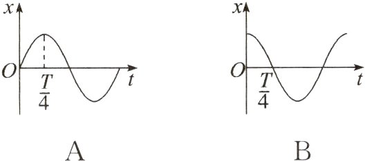 3. 如图所示,一个弹簧振子在A、B间做简谐运动,O点是平衡位置,以某时刻作为计时起点(t = 0),经过$\frac{T}{4}$,小球具有正方向的最大速度。那么下列四幅图像中能够正确反映振子的振动情况的是( )