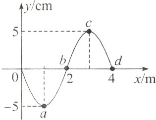 (2)在波的传播过程中,质点并不随波迁移,故不能说质点b沿x轴迁移了1 m。在$\frac{T}{4}$内,质点b向上振动到最高点,即运动了5 cm。