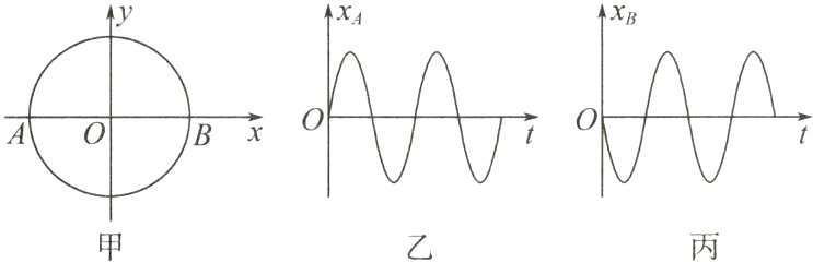 5. 如图甲所示,在操场平面内建立平面直角坐标系,平面内有一半径为$R = 10\ m$的圆形轨道,圆心在O处,A、B分别为圆上两点。现于$A( - 10\ m,0)$、$B(10\ m,0)$两点分别安装了两个扬声器。两个扬声器连续振动发出简谐声波,其振动图像如图乙、丙所示。已知声波在空气中的传播速率为$v = 340\ m/s$,两波频率均为$f = 85\ Hz$,振幅相等。试求:
