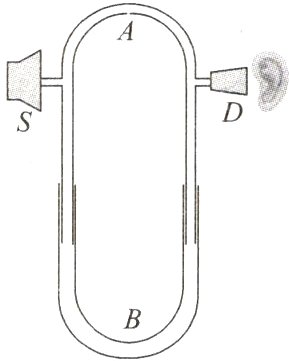 3.(多选)如图所示为某一声波干涉仪结构简化图。S端为扬声器,D端为声音强度测试器,路径SAD长度固定,路径SBD的长度可调节。干涉仪内有空气,由于SAD和SBD的长度不同,声波通过两个不同路径到达D端时的振幅不同。声音强度用I表示,单位为分贝(dB),在控制其它影响因素不变的情况下,I与声波的振幅A的平方成正比。调节SBD的长度,使测试器测试到的声音强度出现最小值为$I_1 = 50\ dB$,在保持测试器和其它部分不动的情况下,将SBD中的可调节部分缓慢向下移动2.5 cm时,测试到声音强度第一次出现最大值,为$I_2 = 450\ dB$。下列说法正确的是( )