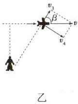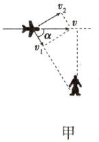 A 解析:当飞机飞近人时,将飞机的速度分解,如图甲所示,飞机相对人的速度为$v_1 = v\cos\alpha$,$\alpha$越来越大,则$v_1$越来越小,人听到飞机声音的频率越来越低,但总是$f_{听}>f_{源}$;当飞机远离人时,将飞机的速度分解如图乙所示,飞机相对人的速度$v_3 = v\cos\beta$,$\beta$越来越小,则$v_3$越来越大,则人听到飞机声音的频率越来越低,且都是$f_{听}<f_{源}$,故在飞机飞过头顶的过程中人听到的声音频率一直是越来越低,即A项正确。