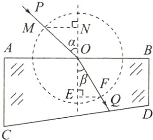 (2)以入射点O为圆心,以R = 5cm为半径画圆,与入射光线PO交于M点,与折射光线OQ交于F点,过M、F点分别向法线作垂线,量得MN = 1.68cm,EF = 1.12cm,则该玻璃砖的折射率n为多大?