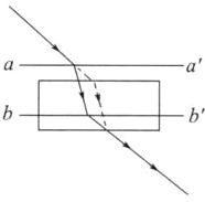 (1)因为玻璃砖的上、下表面不平行,易知出射光线和入射光线不平行。