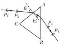 2. 利用三棱镜做测定玻璃折射率的实验,先在白纸上放好三棱镜,在三棱镜的一侧插上两枚大头针P₁和P₂,然后在三棱镜的另一侧观察,调整视线,使P₁的像被P₂的像挡住,接着在眼睛所在的一侧插两枚大头针P₃、P₄,使P₃挡住P₁、P₂的像,P₄挡住P₃本身和P₁、P₂的像。在纸上标出大头针的位置和三棱镜的位置如图所示。