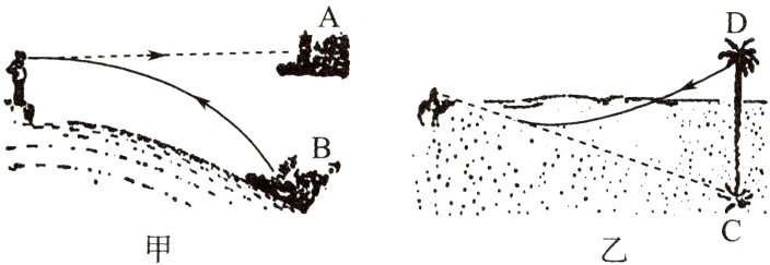 1. 如图甲所示,夏天,在平静无风的海面上,向远方望去,有时能看到山峰、船舶、楼台、亭阁、集市、庙宇等出现在远方的空中。古人不明白产生这种景象的原因,对它作了不科学的解释,认为是海中蛟龙(即蜃)吐出的气结成的,因而叫作“海市蜃楼”,也叫蜃景。如图乙所示,沙漠里有时也会看到远处的水源、仙人掌近在咫尺,却可望而不可即,这也是蜃景。下列有关蜃景的说法错误的是( )