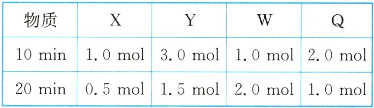 C 解析:从表格数据可看出X、Y、Q的物质的量减少,而W的物质的量增加,说明X、Y、Q是反应物,W是产物。在同一容器中,相同时间内,各物质的反应速率之比等于物质的量变化量之比,等于化学计量数之比。$\Delta n(X):\Delta n(Y):\Delta n(Q):\Delta n(W)=(1.0mol - 0.5mol):(3.0mol - 1.5mol):(2.0mol - 1.0mol):(2.0mol - 1.0mol)=1:3:2:2$,所以X、Y、Q、W的化学计量数之比为1:3:2:2,故C正确。