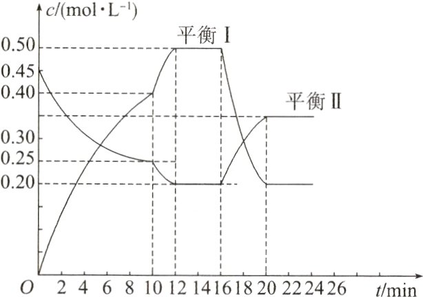 解析:(1)$0\sim10min$内$v(A)=\frac{(0.45 - 0.25)mol\cdot L^{-1}}{10min}=0.02mol\cdot L^{-1}\cdot min^{-1}$。(2)根据图像可知,$0\sim10min$内A的物质的量浓度减少量为$0.2mol\cdot L^{-1}$,C的物质的量浓度增加量为$0.4mol\cdot L^{-1}$,$x、y$之比等于A、C的物质的量浓度变化量之比,故$x:y = 0.2mol\cdot L^{-1}:0.4mol\cdot L^{-1}=1:2$。(3)该反应是气体分子数增大的反应,而容器容积不变,因此$0\sim10min$容器内压强变大。(4)根据图像可知,10 min时改变条件后,A、C的浓度瞬时不变且随后反应速率加快,故改变的条件可能是升温或加入催化剂;16 min时改变条件后,A、C的浓度瞬时不变,且随后A的浓度逐渐增大,C的浓度逐渐减小,说明平衡逆向移动,故改变的条件可能是升温。