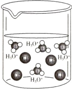 HCl在水中电离示意图 CH₃COOH在水中电离示意图