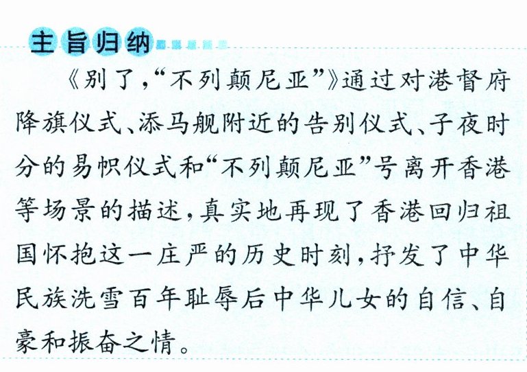 (3)对于中国人民来说,英国在香港进行殖民统治的这段历史是刻骨铭心的,是不应该被忘记的。随着中国改革开放的不断深人,综合国力的不断提高,中国人民经过漫长的等待,终于迎来了香港回到祖国怀抱的这一天,国旗是一个国家主权的体现,是一个国家的象征,作者郑重地记录下五星红旗第一次在香港升起的时刻,含蓄地表达了庄严而喜悦的心情,预示着香港美好的明天开始了。