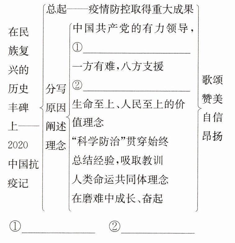①点明事件的主要内容、涉及的主要人物以及中国人民团结一致战胜疫情的重大历史意义。②领起下文,下面的八节都是由此引发。