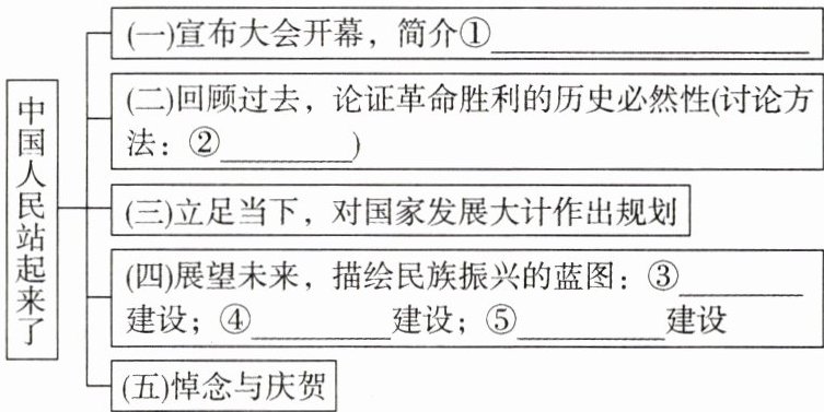 1. ①围绕“中国人民站起来了”这一中心,作者阐述了三方面内容:一是回顾过去,回顾中国近代一百多年来尤其是三年多的解放战争历程,阐述“中国人民站起来了”的历史必然性;二是立足当下,正式宣布“中国人民站起来了”,对国家发展大计做出规划,阐述了“站起来”的伟大历史意义;三是展望未来,描绘出民族振兴的壮丽蓝图,阐述“中国人民站起来了”以后的美好前景。②关联:第一部分是第二部分的因,第二部分是第一部分的果;第二部分又是第三部分的基础和前提。2. ①国内意义:中华人民共和国的成立,开辟了中国历史的新纪元。中国结束了一百多年来被侵略、被奴役的屈辱历史,真正成为一个独立自主的国家。中国人民的政治地位和经济、文化、生活水平从此可以得到切实的保障,并不断提高。中国人民从此站起来了,成为国家的主人。②国际意义:中华人民共和国的成立,壮大了民主和社会主义的力量,鼓舞了世界被压迫民族和被压迫人民争取解放的斗争。3. 中国人民政治协商会议在自己的议程中将要制定中国人民政治协商会议的组织法,制定中华人民共和国中央人民政府的组织法,制定中国人民政治协商会议的共同纲领,选举中国人民政治协商会议的全国委员会,选举中华人民共和国中央人民政府委员会,制定中华人民共和国的国旗和国徽,决定中华人民共和国国都的所在地以及采取和世界大多数国家一样的年号。
