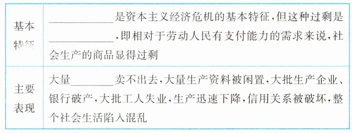 (1)生产过剩 相对过剩 商品 (2)①生产 需求 ②生产社会化和生产资料资本主义私人占有之间的矛盾,是资本主义社会的基本矛盾,也是经济危机难以治愈的根本原因