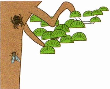 蜘蛛想把苍蝇当měi cān(美餐),结果它们都被松树shèn(渗)出的一大滴sōng zhī(松脂)包裹住了。它们zhēng zhá(挣扎)了yì fān(一番)后便不能动了。