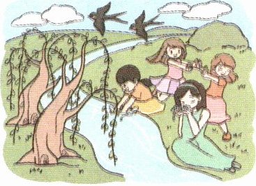 它看见燕子飞过天空,翅膀上裹着白云;它看见垂柳披上了长发,如雾如烟;它看见一群姑娘来到河边,水底立刻浮起一朵朵红莲,她们捧起了水,像抖落一片片花瓣……