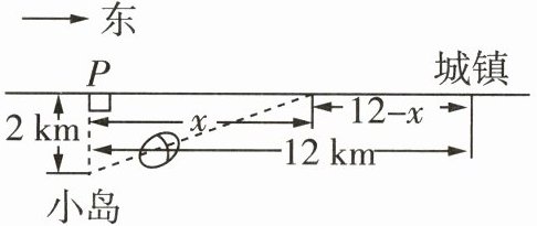 11.[2023枣庄八中期末]如图所示,一座小岛距离海岸线上最近的P点的距离是2 km,从P点沿海岸正东12 km处有一个城镇.假设一个人准备从小岛到城镇去,已知驾驶的小船的平均速度为3 km/h,步行的速度为5 km/h,t(单位:h)表示他从小岛到城镇的时间,x(单位:km)表示此人将船停在海岸处距P点的距离.设$u=\sqrt{x^{2}+4}+x$,$v=\sqrt{x^{2}+4}-x$,则 ( )