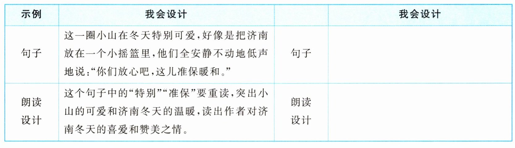 四、朗读要把握作者的情感,注意重音的处理。仿照示例,选择句子进行朗读设计。