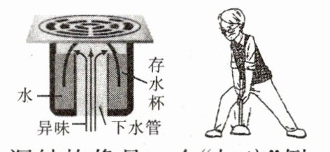 9.(跨学科·物理与生活)如图所示,一种卫生间的地漏结构像是一个“扣碗”倒扣在存水杯上。当存水杯中的水满后,由 __________原理可知,水就会从下水管流出,而下水管中的“异味”却不能通过地漏进入室内。若下水道堵塞了,可以用吸盘疏通,这是利用了 __________的作用。