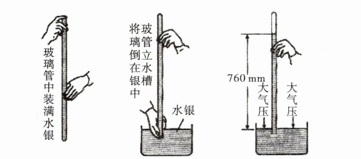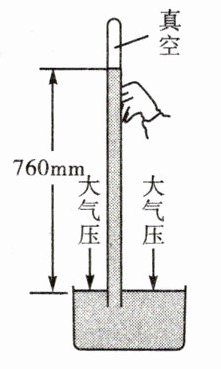 14. 在长约1米、一端封闭的玻璃管里灌满水银,用手指将管口堵住,然后倒插在水银槽中,放开手指,管内水银面下降到一定高度时就不再下降,如图所示。