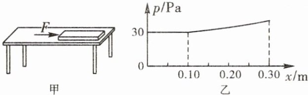 7.(学科素养·科学思维)(2023·福建)如图甲所示,一块质量分布均匀的长木板平放在水平桌面上,对长木板施加一个水平向右的力F,使木板沿着与桌子边缘平行的方向缓慢向右做直线运动,直到木板的$\frac{1}{4}$长度伸出桌面时停止运动,此过程中木板对桌面的压强p与木板被推动的距离x的关系图像如图乙所示。已知木板宽为0.25 m,下列判断正确的是 ( )