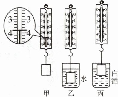 ③把铁块浸在白酒中,读出测力计示数 F₃,如图丙所示。
