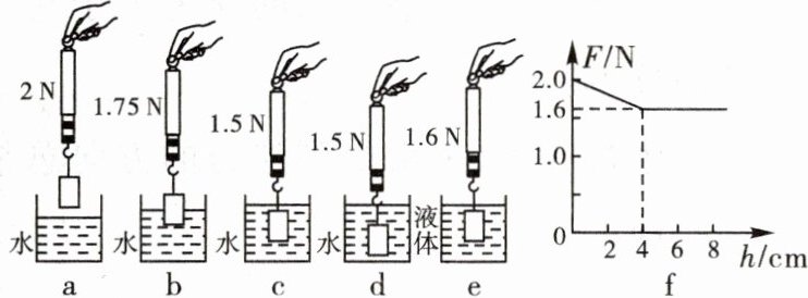 (4)在某种液体中进行探究的过程中,记录实验数据,得到如图 f 所示弹簧测力计读数与物体下表面浸入深度的关系图像,则该液体的密度为 ________ kg/m³。