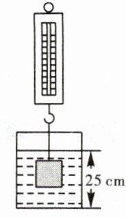 6. 一个边长为 10 cm 的实心正方体(不吸水)重 15 N,将其悬挂在弹簧测力计上并浸没在水中静止时,烧杯内水的深度为 25 cm,如图所示。烧杯内的水对杯底的压强为 ________ Pa,弹簧测力计的示数为 ________ N。(ρ水 = 1.0×10³ kg/m³,g 取 10 N/kg)