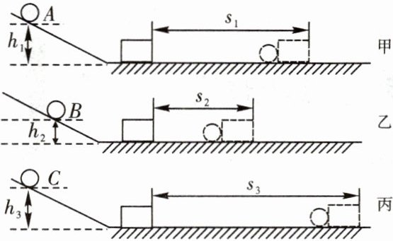 6.在“研究物体的动能跟哪些因素有关”的实验中,如图甲、乙、丙所示,将 A、B、C 三个钢球先后从同一装置高度分别为 h₁、h₂、h₃ 的位置由静止开始滚下(mₐ = mᵦ < mₑ,h₁ = h₃ > h₂),水平面上同一位置的木块被撞出一段距离后停下。请回答以下问题: