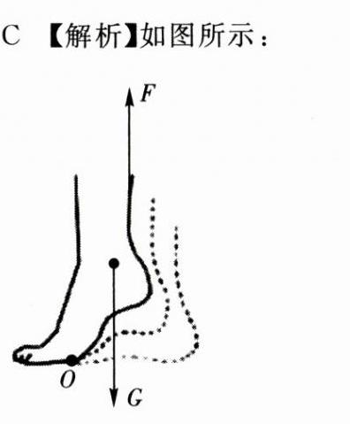 踮脚时,脚掌与地面接触的地方是支点,小腿肌肉对脚的拉力F的方向向上,是动力。人的重力G是阻力,从图中可知动力臂大于阻力臂,是省力杠杆。故选C。