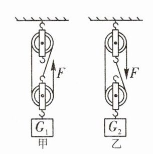 14.如图所示,每个滑轮的重力相等,不计绳重和摩擦力,G₁ = 60 N,G₂ = 38 N,甲、乙两种情况下绳子在相等拉力F作用下静止。则每个动滑轮的重力为( )