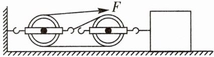 8. (学科素养·科学思维)如图所示,用$F = 50$ N的力通过滑轮组水平拉重为80 N的物体,使其向左匀速运动。在这个过程中拉力$F$做功为40 J,已知物体受到水平地面的摩擦力为60 N,则物体运动的距离为______ m,该滑轮组的机械效率为______。(忽略绳子和动滑轮的重力)