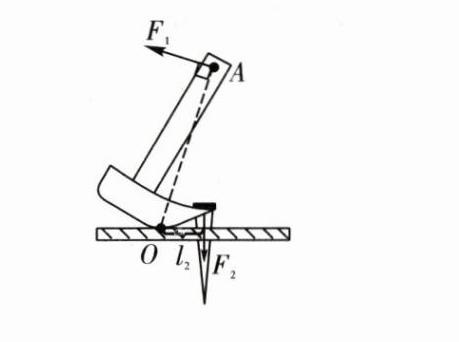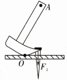 12.如图所示,利用羊角锤撬起钉子,请你在羊角锤A点处画出所能施加的最小动力F₁,并画出阻力F₂的力臂l₂。(F₂与木板表面垂直)