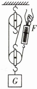 图中物重为 G,弹簧测力计示数为 F,物体被提升高度为 h,动滑轮上绳子段数为 n,绳端移动距离为 s。
