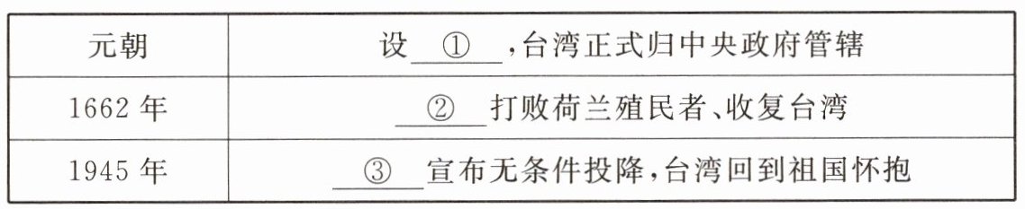 澎湖巡检司@@郑成功@@日本@@(2)解放战争国民党蒋介石集团失败,退往台湾;新中国成立初期美国第七舰队入侵中国台湾海峡,阻止人民解放军解放台湾。@@(3)发展:从主张和平统一到明确提出“一国两制”的观点(或明确提出在大陆和台湾分别实行社会主义、资本主义制度)。@@(4)现象:海峡两岸经贸交流不断发展,贸易额不断增长。@@(5)态度:台湾是中国的一部分,一定要解决台湾问题,实现祖国统一大业。认识:台湾自古以来就是中国的领土,面对一些别有用心的“台独”分子的分裂行为,我们应坚决抵制,自觉维护祖国统一;祖国统一大业终将实现。(言之有理即可)