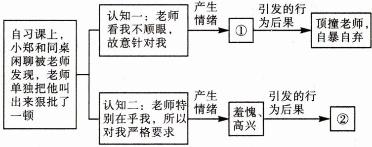 11.情绪是生活的一部分,我们既体验着自己的情绪,也经常观察他人的情绪表现。步入青春期的你了解情绪吗?下面的思维导图呈现的是小郑同学在自习课上说闲话被老师批评后,可能产生的认知、情绪及后果。