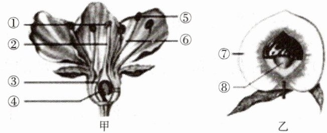 21.如图甲是桃花的结构示意图,图乙是桃的果实剖面示意图,请据图分析并回答下列问题。
