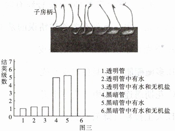 (4)为了研究花生人地才能结荚的原因,兴趣小组同学设计了如下实验:待子房柄长度为3~5 cm、尚未入土时,将子房插入玻璃管中,观察不同处理条件下花生结荚情况(结荚级数代表子房发育程度)。实验共分6组,各组处理及实验结果如图三。