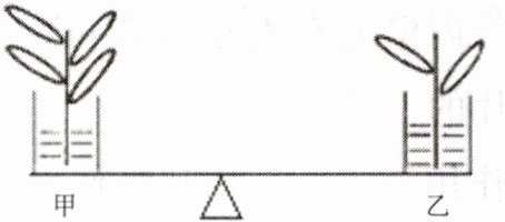 16.如图所示天平两端托盘上的盛水烧杯内各插有1根树枝,且两根树枝的树叶一多一少,开始时天平两端平衡。现将此装置移至光下照射一段时间后,天平将发生的变化是 ( )