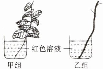 19.(新理念·探究实践)取甲乙两个相同的枝条,将乙的叶片全部摘除后,同时插入两个装有红色溶液的烧杯中,如图,下列分析正确的是 ( )
